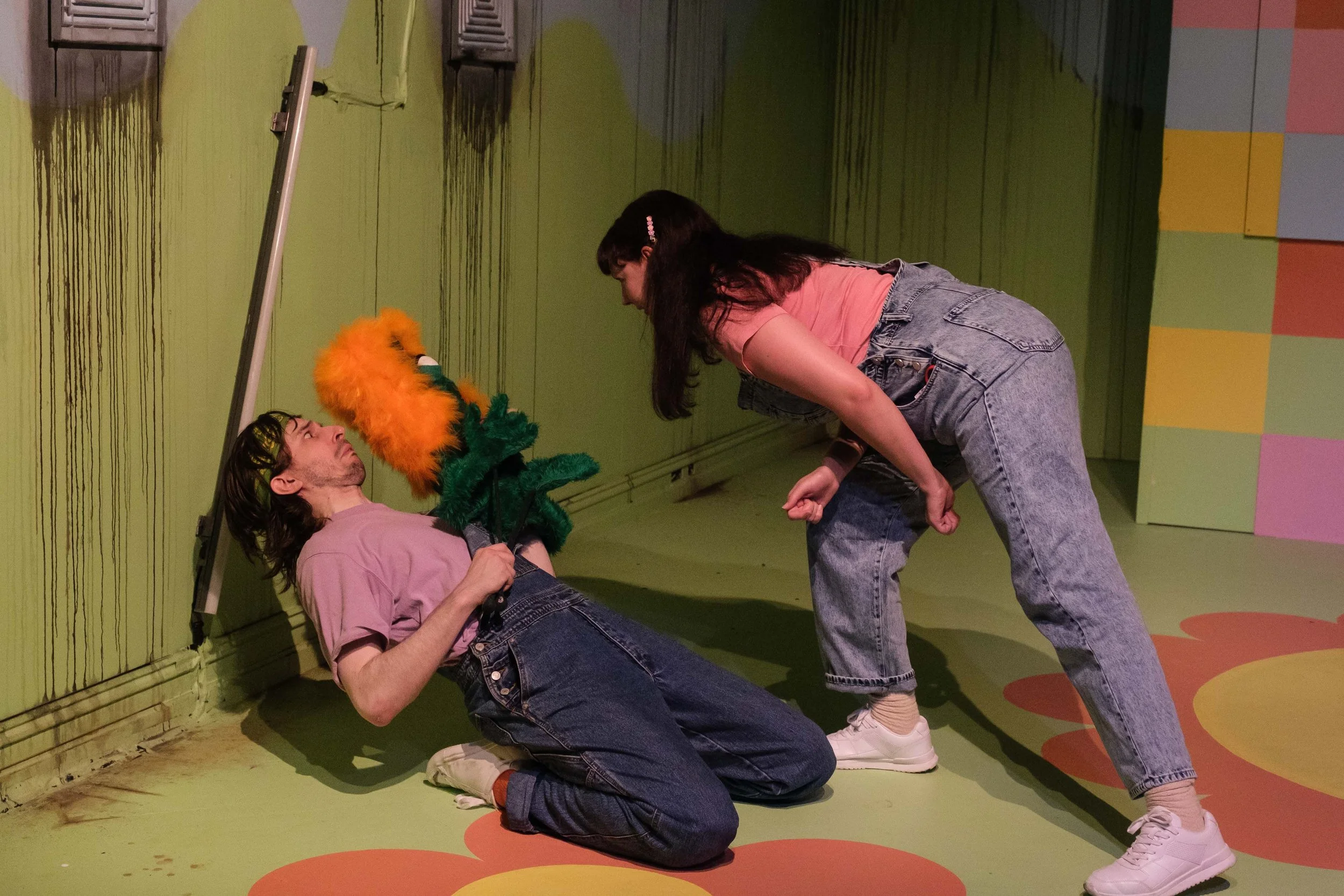 Miss Melissa (Nicole Wineberg) has saved four little monsters from certain doom after the climate collapse by letting them bunk with her in “Haven” – the happiest bunker on Earth. Schnerk (Nathan Porteus) is a blue friend with an eyepatch, Blurkina (Zoe Crawford) is a red neat-freak with pink bows on her head, Glorbo (a dopey Matt Abotomey) is a cylindrical green silly-billy and Titzi (the fabulously toddler-ish Lib Campbell) is a yellow weirdo who is obsessed with pools. The monsters are so grateful for Miss Melissa, because she is eerily kind and upbeat, but also because she is literally the hand that feeds them. That’s their only problem with being puppets – they aren’t dextrous enough to look after themselves.