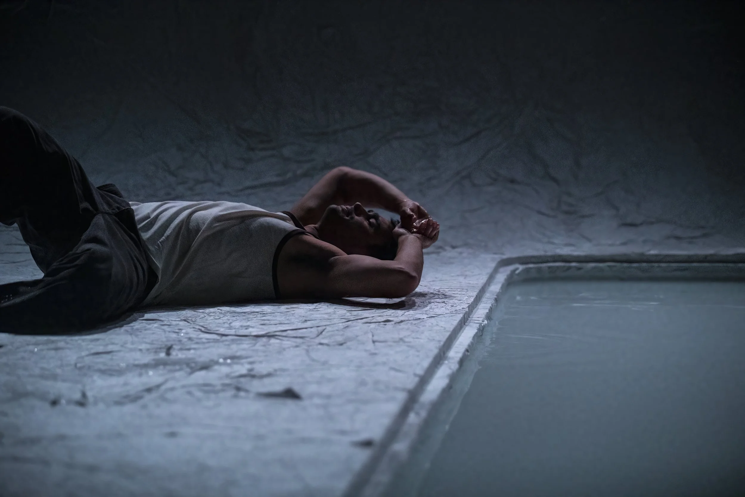 Weatherall is not afraid to write vulnerably. The stage design by Cris Baldwin and Jacob Nash is a considered blank slate that allows this vulnerability to be communicated continuously to the audience. A white, subtly-textured wave looms above the actor as he lithely navigates the stage, partly thanks to Blue's director, Bangarra Dance Company alum, Deborah Brown. Projections and minimalist sound design fill the space as Weatherall’s fictional counterpart, Mark, describes his journey growing up with his family and the ocean. His story is brought to life by the makeshift river that opens up in the centre of the stage; Mark splashes barefoot into this ocean of his own making, recounting moments of joy, sorrow, and misunderstanding.